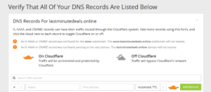 - Once CloudFlare has scanned all the DNS records, it will ask you to verify them. Make sure that there’s an orange CloudFlare icon beside your main/original domain name. This is the domain, which will be accelerated by CloudFlare.
